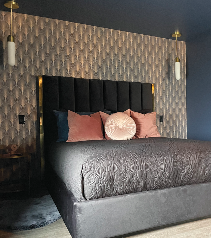 Lush Queen bed flanked with dimmable lights for intimate lighting.